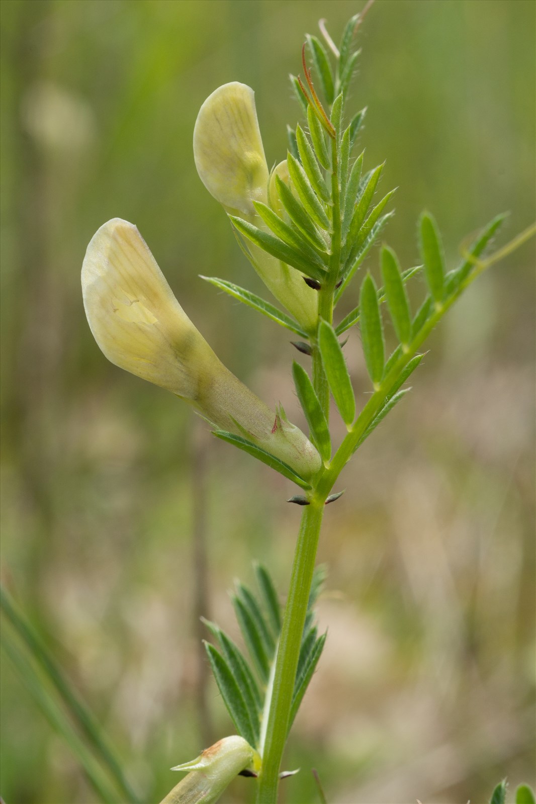 Plante annuelle de 20-50 cm, peu velue, grêle, grimpante ; feuilles à 5-7 paires de folioles linéaires-oblongues, obtuses et mucronées ; vrilles rameuses ; stipules entières ou bilobées ; fleurs d'un jaune pâle ou teintées de violet, grandes, axillaires, solitaires ou géminées, subsessiles ; calice glabre, en cloche, à dents très inégales, les 2 supérieures courtes et conniventes, l'inférieure plus longue que le tube ; étendard très glabre ; gousse de 25-30 mm sur 8-9, oblongue, stipitée, hérissée de poils blancs renflés-tuberculeux à la base, pendante et noirâtre à la maturité; graines globuleuses.