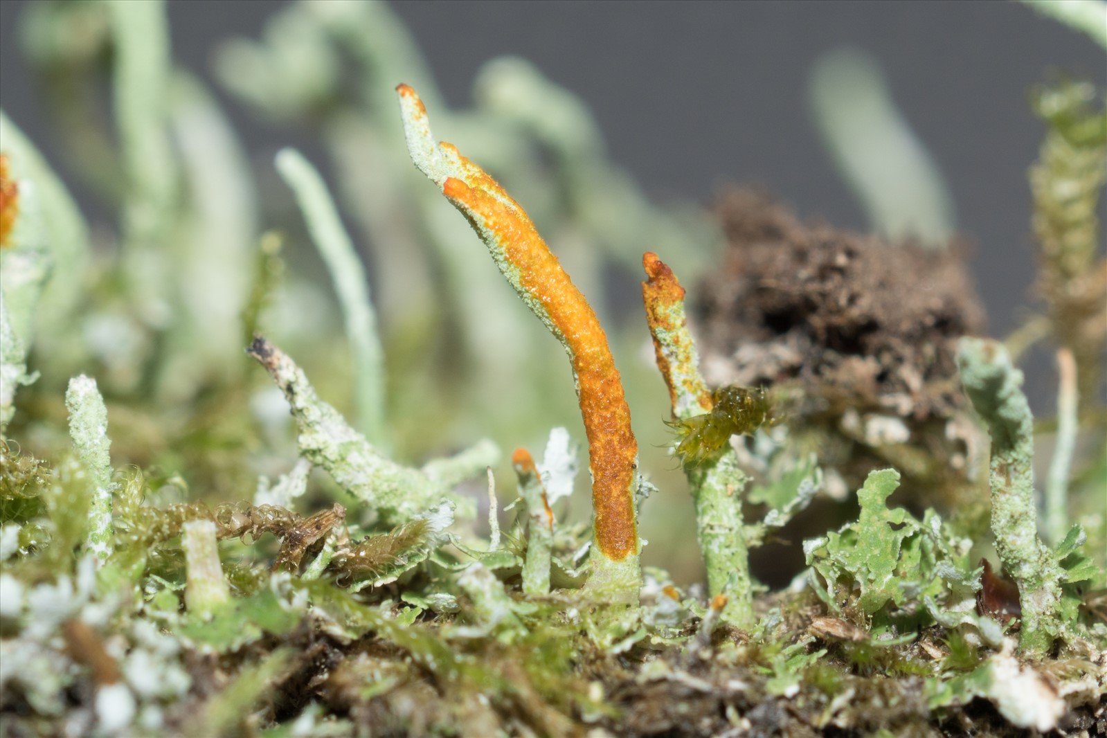 On rencontre ce lichen fréquemment en milieu forestier dans toute la France sur les mousses et les bois morts. Son thalle est constitué de squamules à lobes crénélés. Sa couleur est vert grisâtre sur la partie supérieure. La face inférieure est blanchâtre. Ce lichen possède des podétions assez souvent courbes avec des sorédies. La réaction colorée en rouge se fait avec P+.